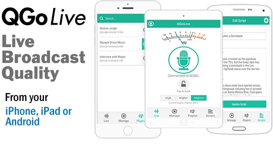 QGoLive lets you do broadcast quality live shots using your iPhone, iPad, Android, PC and Mac. All it takes is an iPhone to do a live shot in hifi - no external equipment is required. It lets you stack and switch multiple reporters for a round robin. You can also insert and play out multiple cuts of audio recorded in an external app.